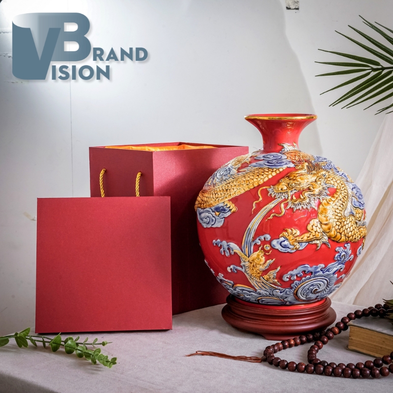 Bình hút lộc Bát Tràng họa tiết long quyền đắp nổi màu đỏ BHL-01