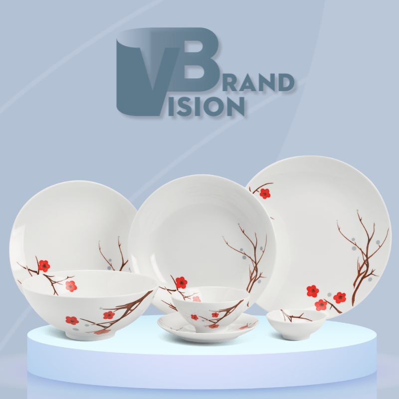 Bộ bát đĩa gốm sứ trắng họa tiết hoa mai đỏ BD-02